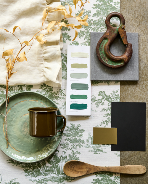 Vintage is een mix van karakter en lef. Donkergrijs, okergeel en groen voeren de boventoon, samen met warme tinten die doen denken aan hout, leer en metaal. Het kleurpalet voelt rijk en uitgesproken, zonder schreeuwerig te worden.
